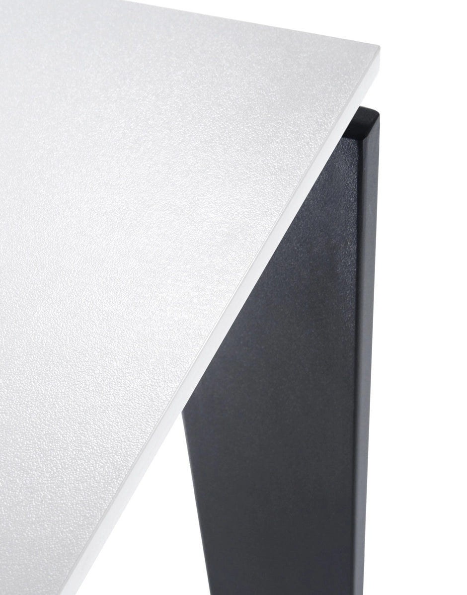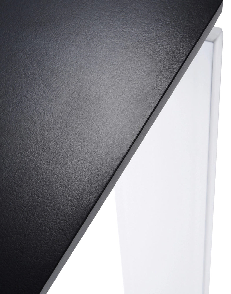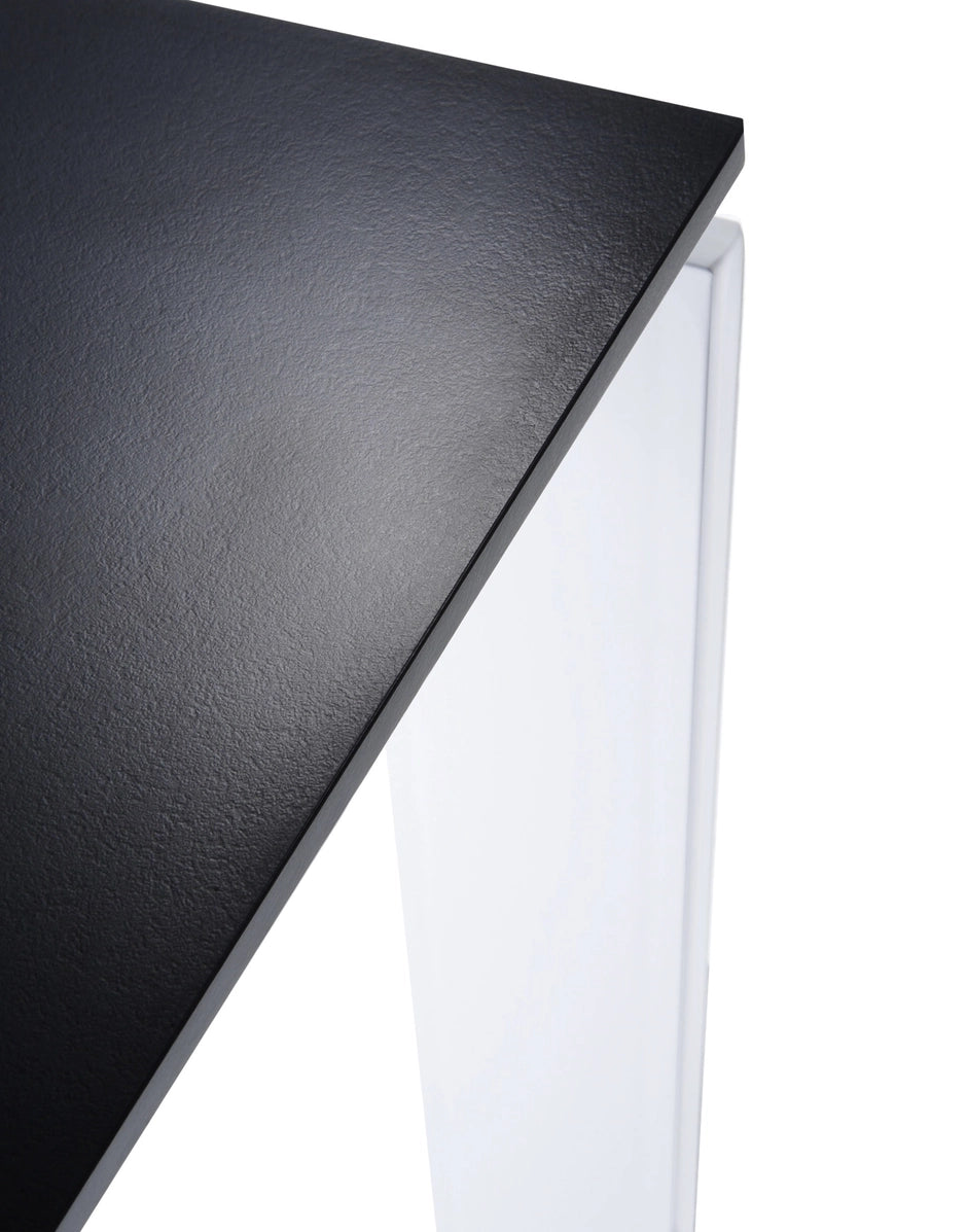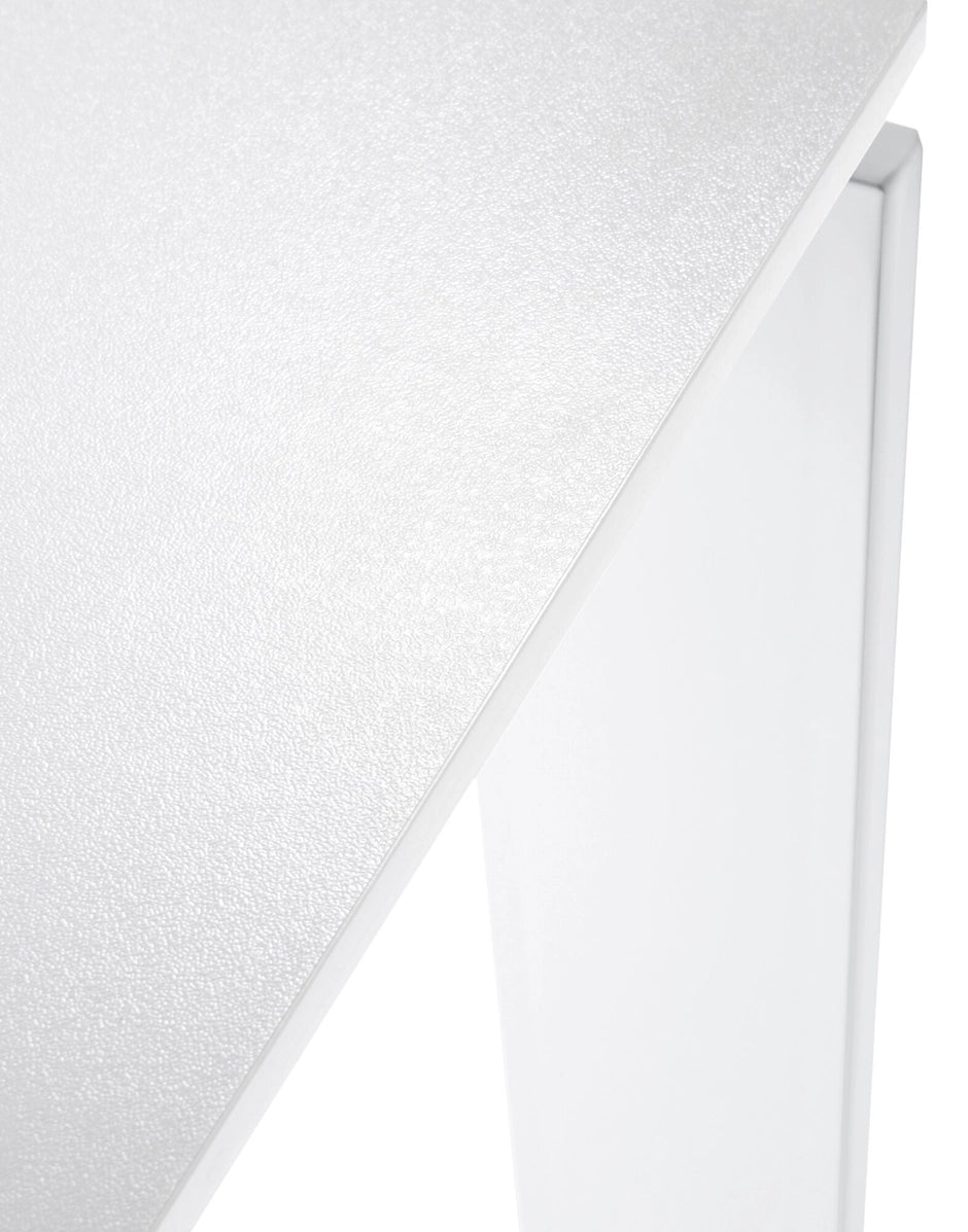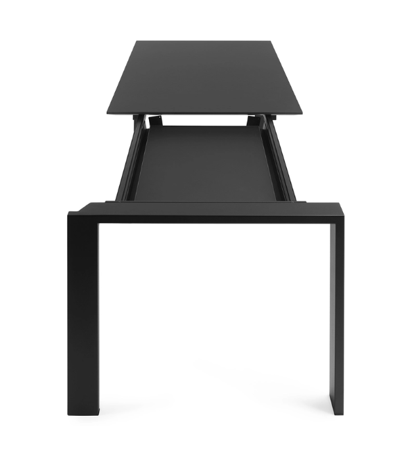 Una mesa funcional y refinada, con un diseño riguroso y geométrico. Gracias a una elegante solución del proyecto la posición del delgado tablero permite colocar fácilmente cajoneras o muebles contenedores para soportes informáticos. En oficinas se puede utilizar combinando varios elementos para componer zonas operativas.