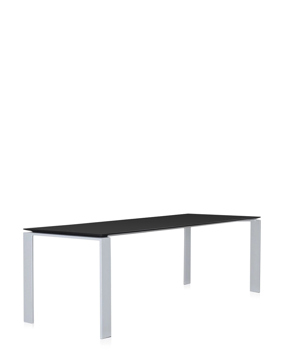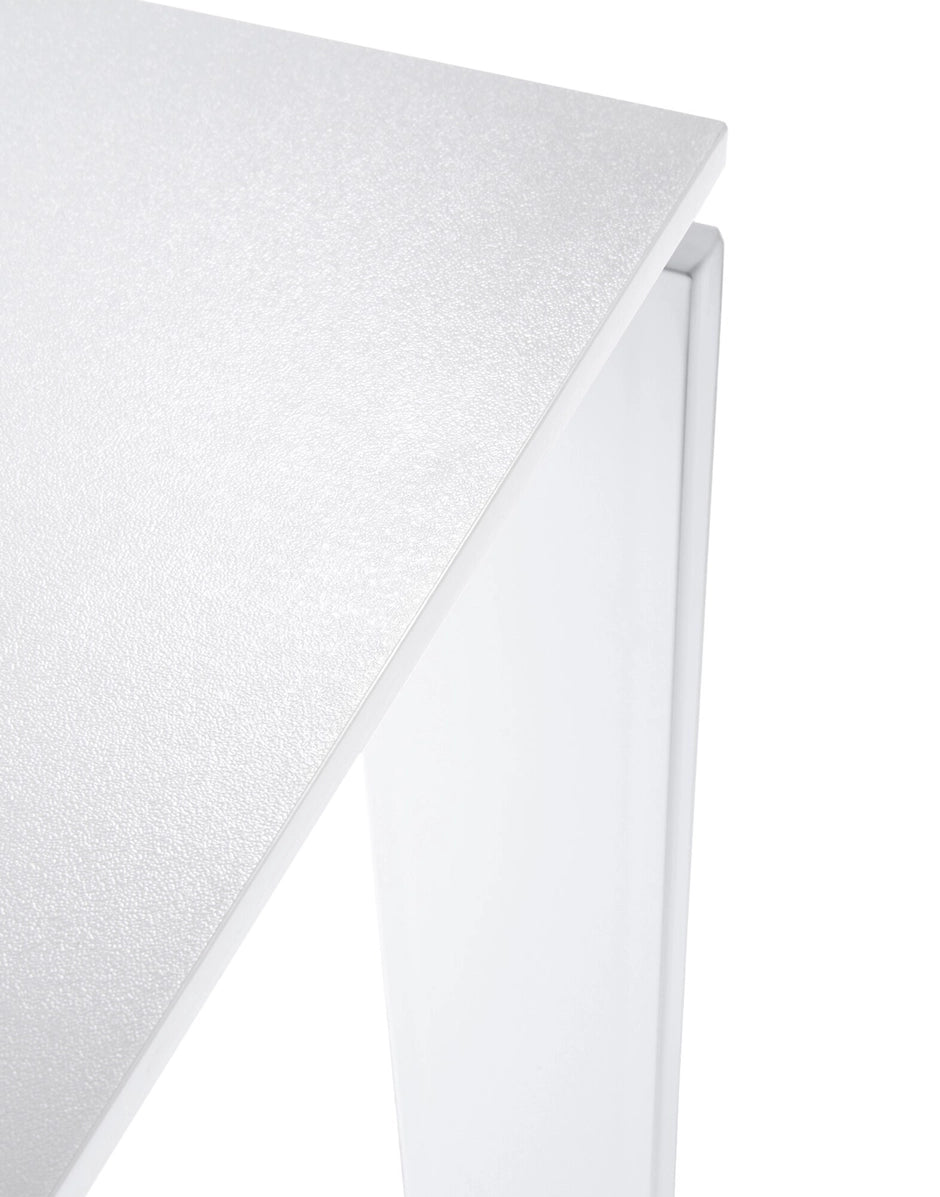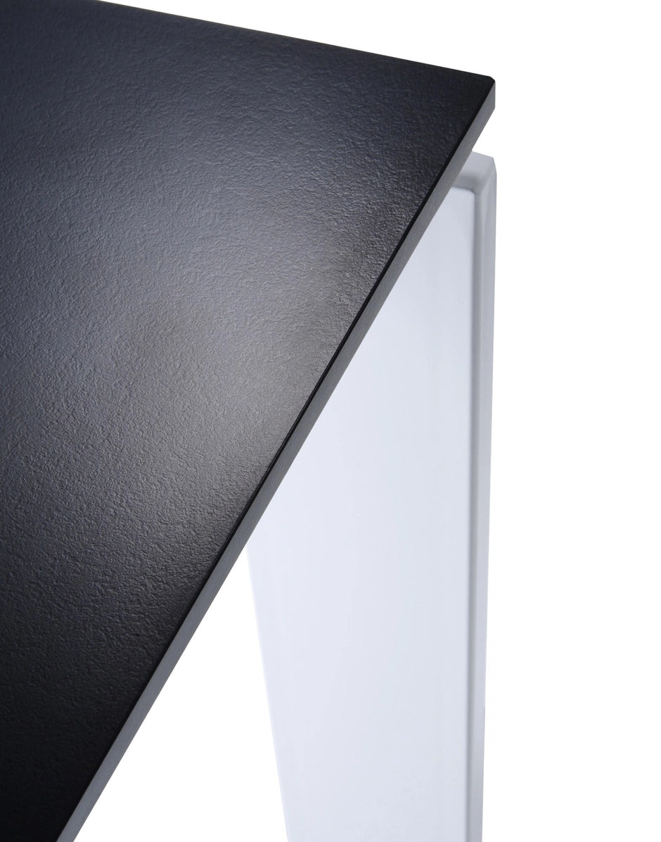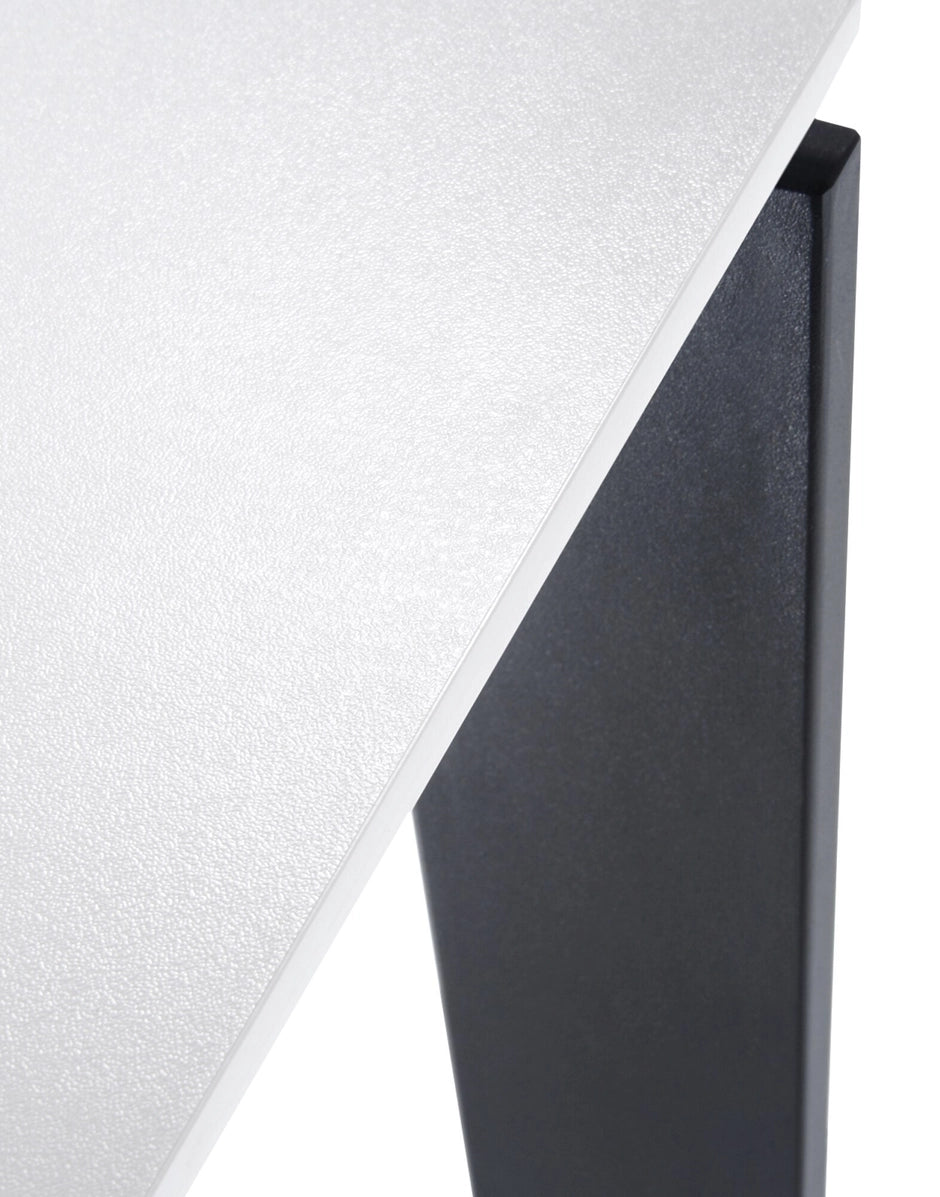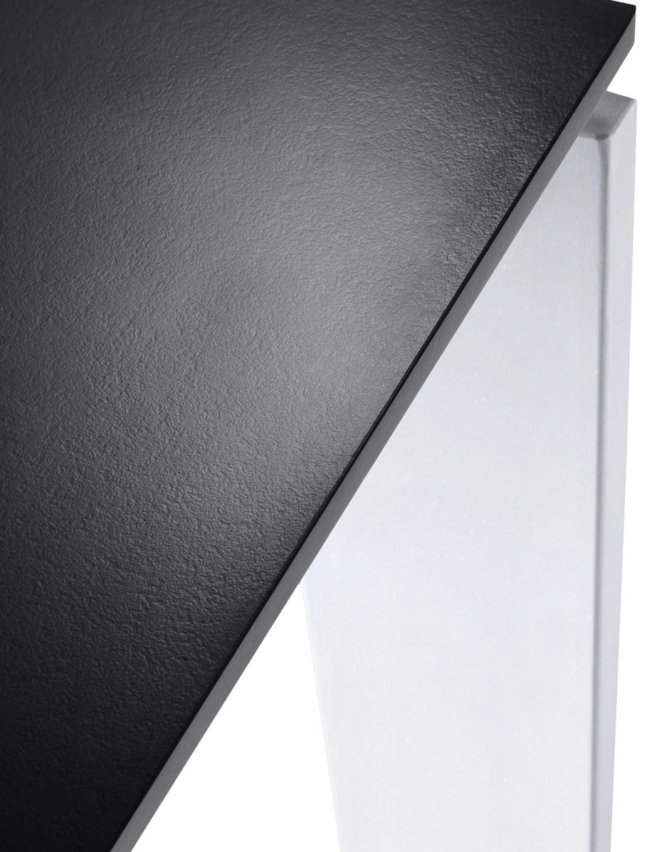 Una mesa funcional y refinada, con un diseño riguroso y geométrico. Gracias a una elegante solución del proyecto la posición del delgado tablero permite colocar fácilmente cajoneras o muebles contenedores para soportes informáticos. En oficinas se puede utilizar combinando varios elementos para componer zonas operativas.